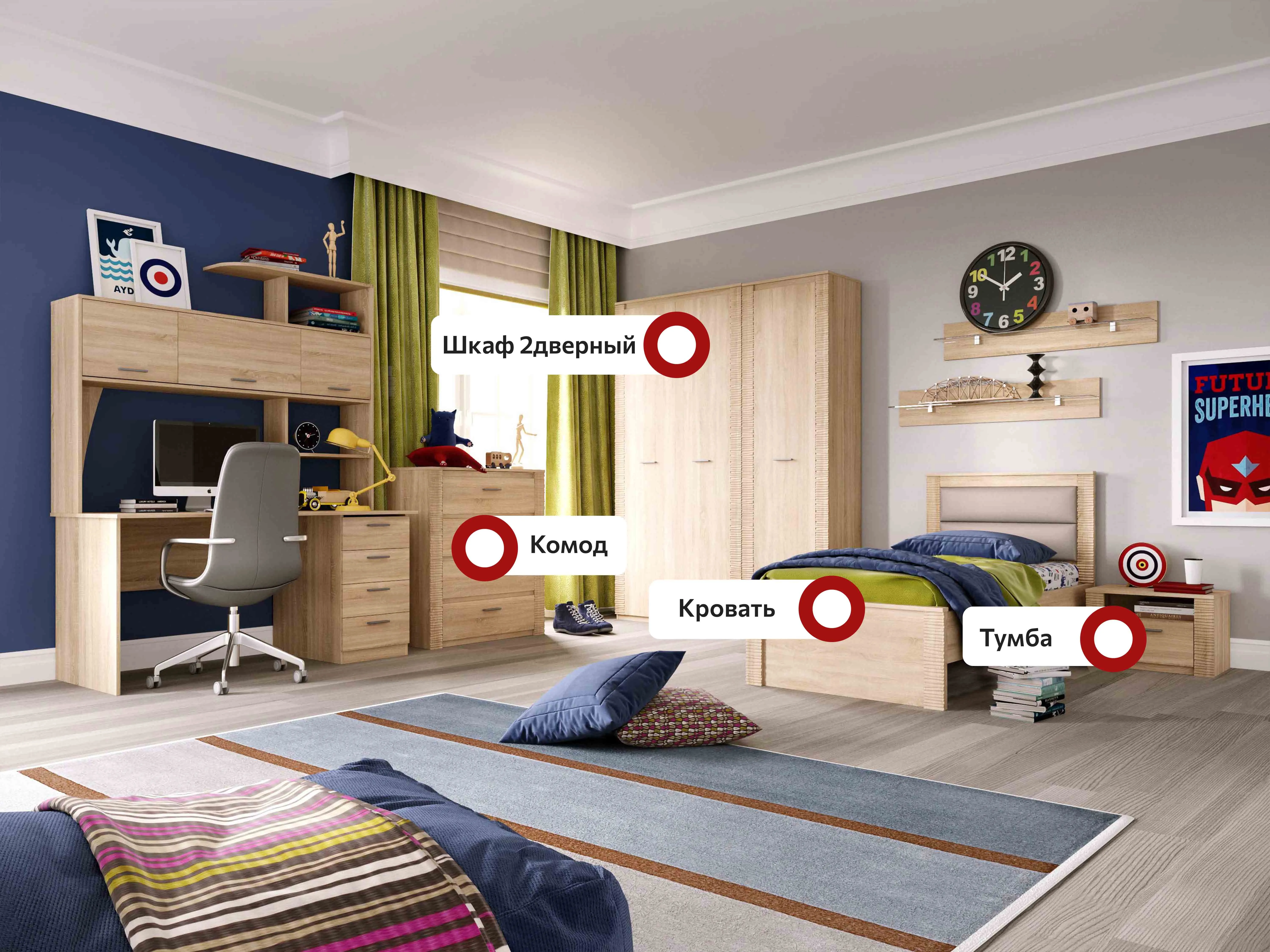В состав коллекции входят: шкаф однодверный, шкаф угловой, шкаф двухдверный, комод, стол компьютерный, тумба прикроватная, кровать.