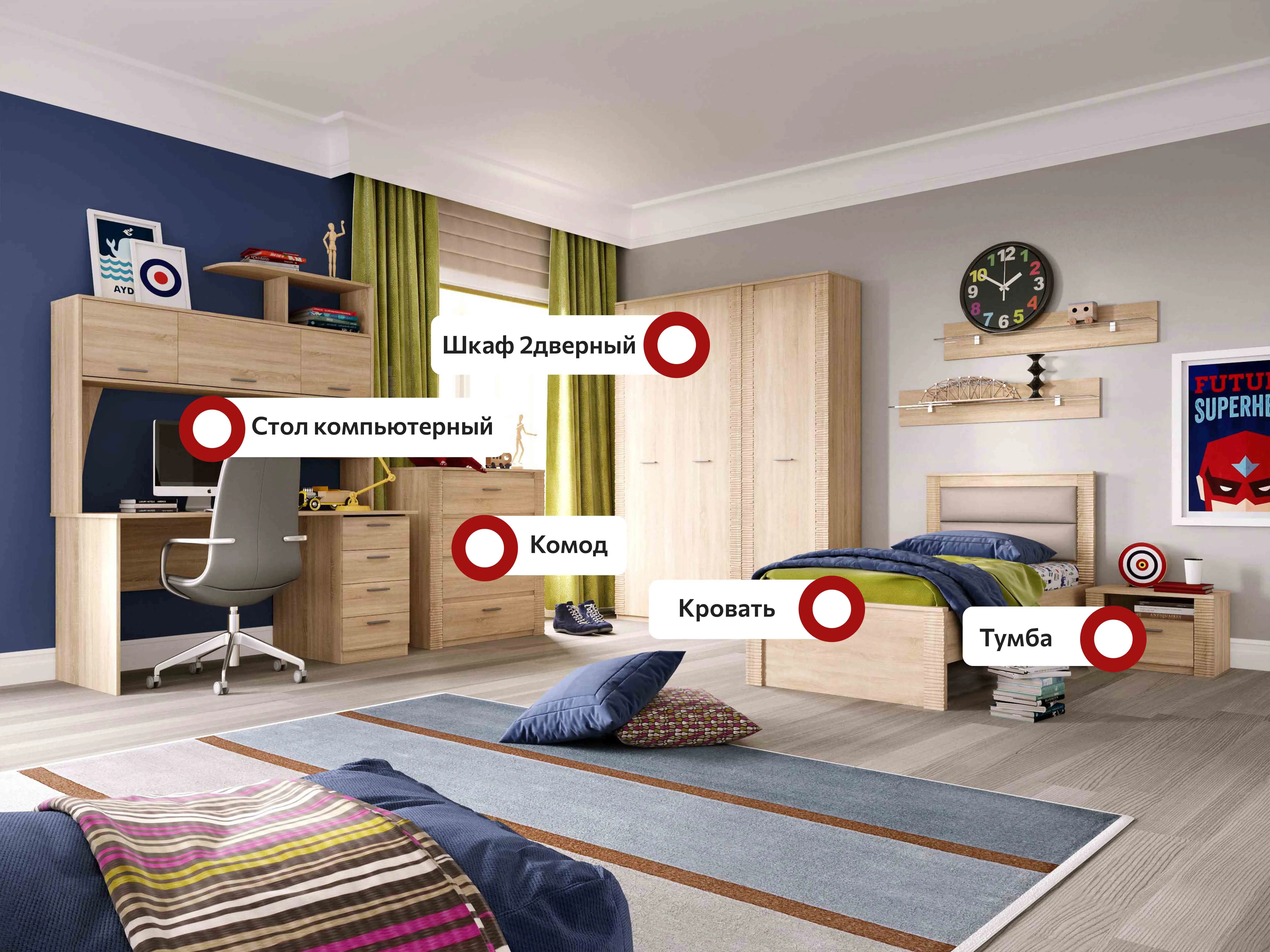 В состав коллекции входят: шкаф однодверный, шкаф угловой, шкаф двухдверный, комод, стол компьютерный, тумба прикроватная, кровать.