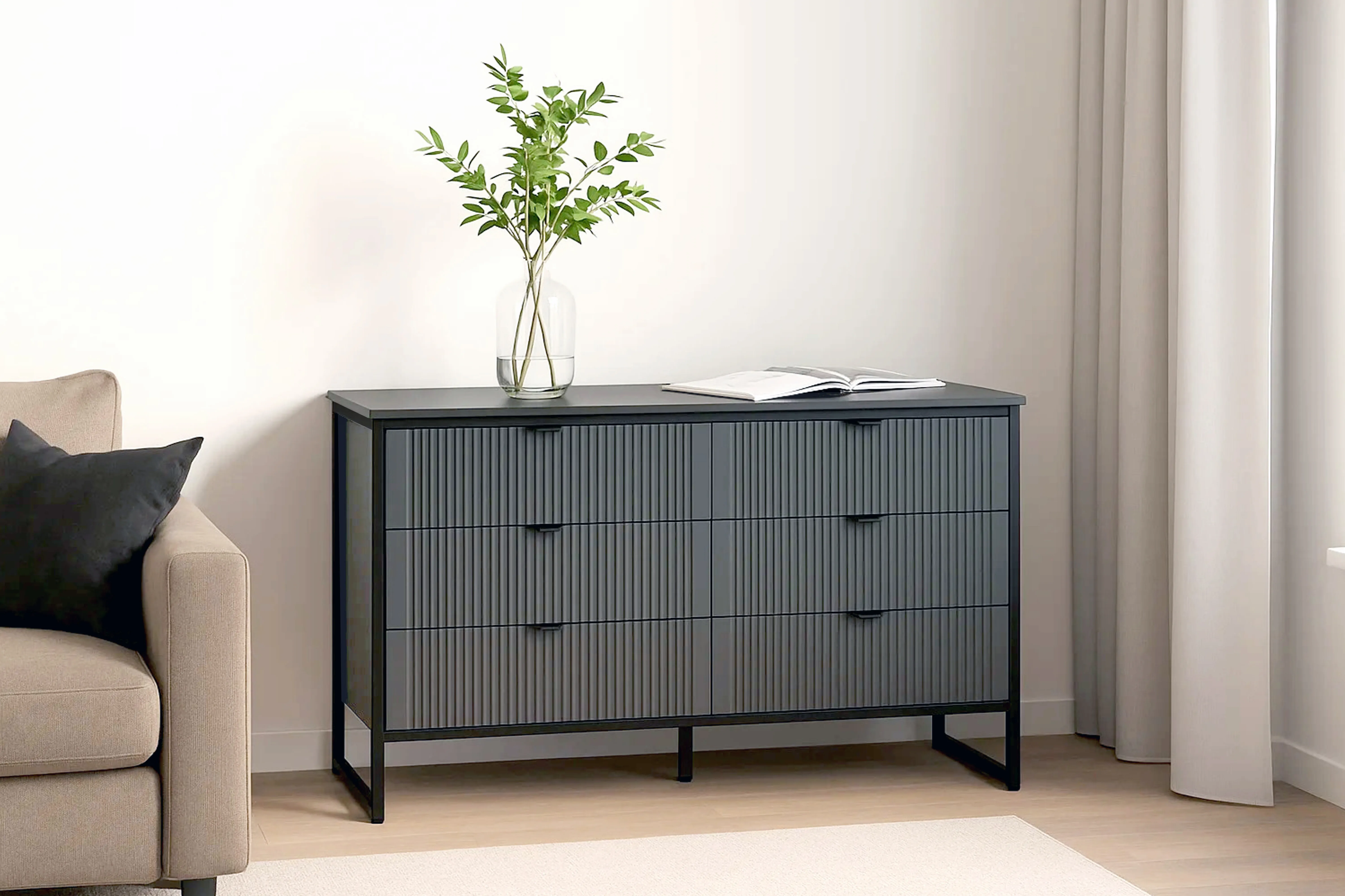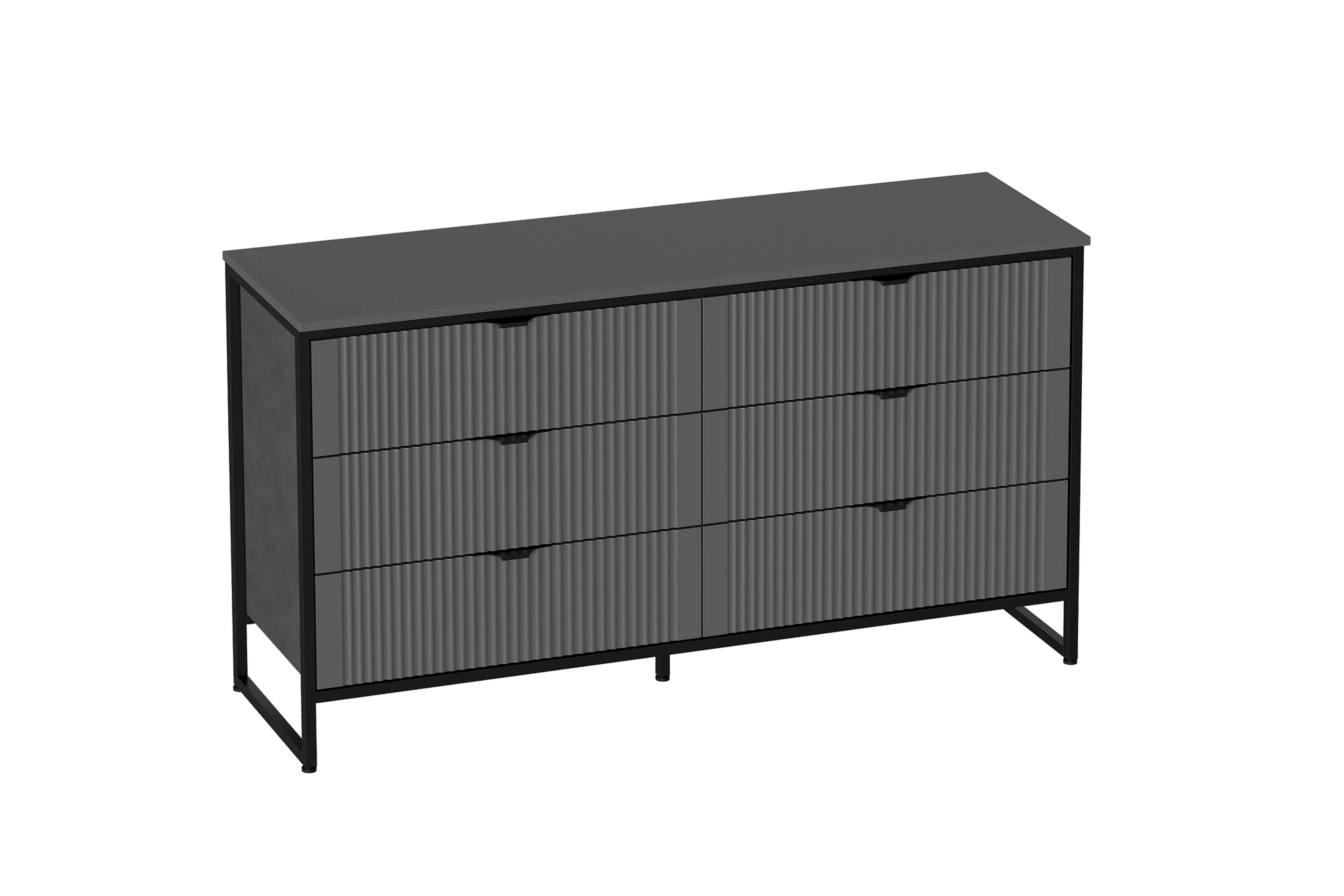 Комод "Нора" на металлокаркасе состоит из выдвижных ящиков, что позволяет удобно хранить вещи и поддерживать порядок в комнате. Внутреннее пространство разделено стенкой на два отделения, в каждом из которых установлены по три выдвижных ящика на шариковых направляющих с доводчиками. Он выполнен из безопасных, качественных материалов (лдсп и мдф), что гарантирует долговечность и сохранение первоначального вида на протяжении долгого времени.