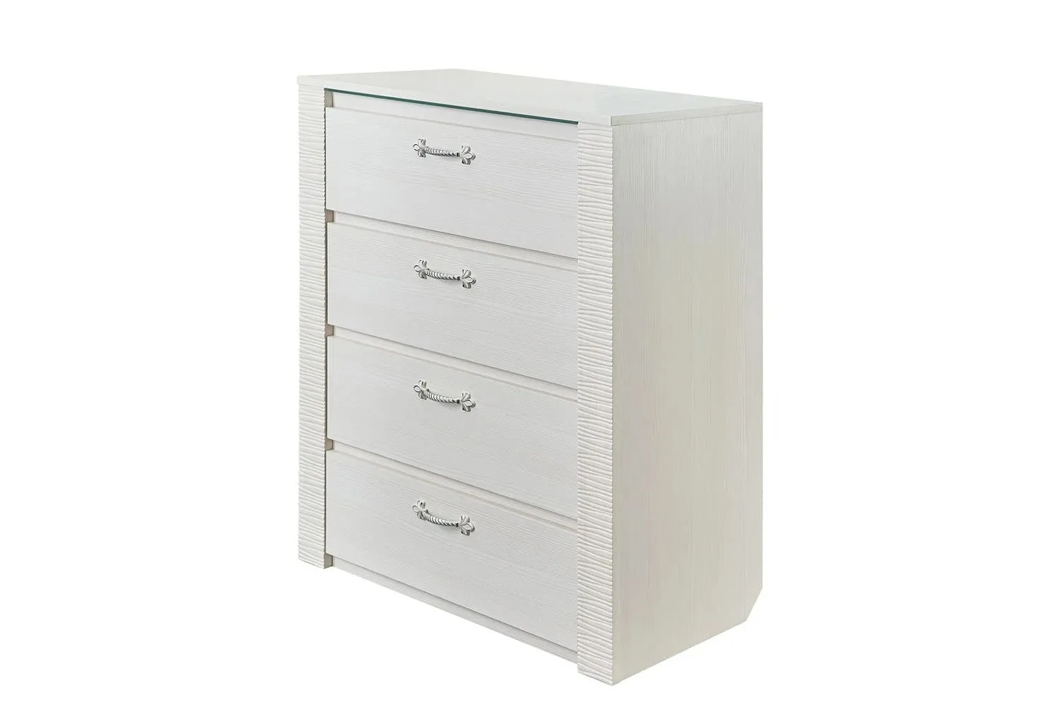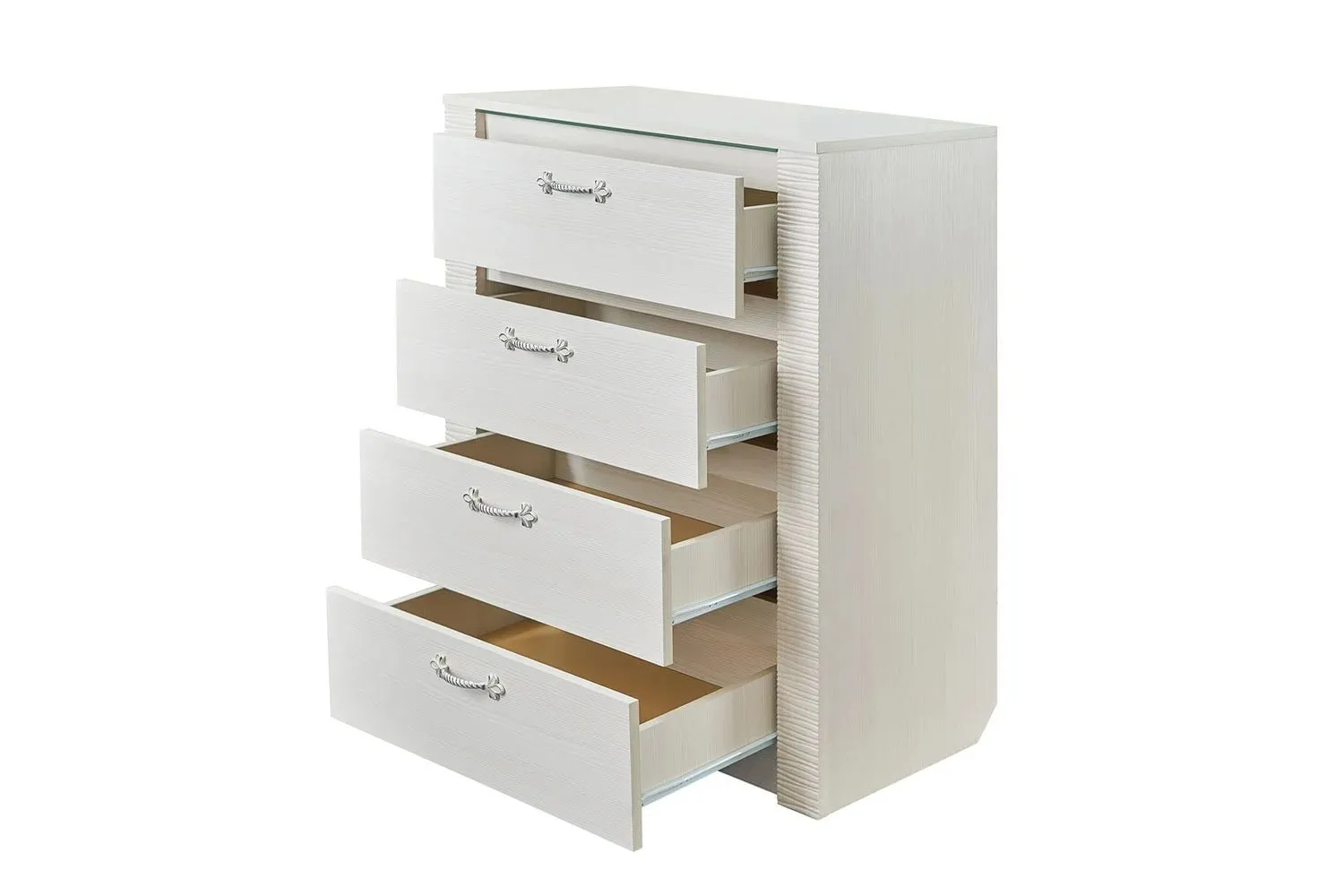 Комод оснащен четырьмя выдвижными ящиками на роликовых направляющих. Под столешницей имеется стеклянная панель (5 мм), предназначенная для установки светильника. Комплект подсветки (светильник и блок питания) приобретается отдельно. Блок питания рассчитан на подключение шести светильников.