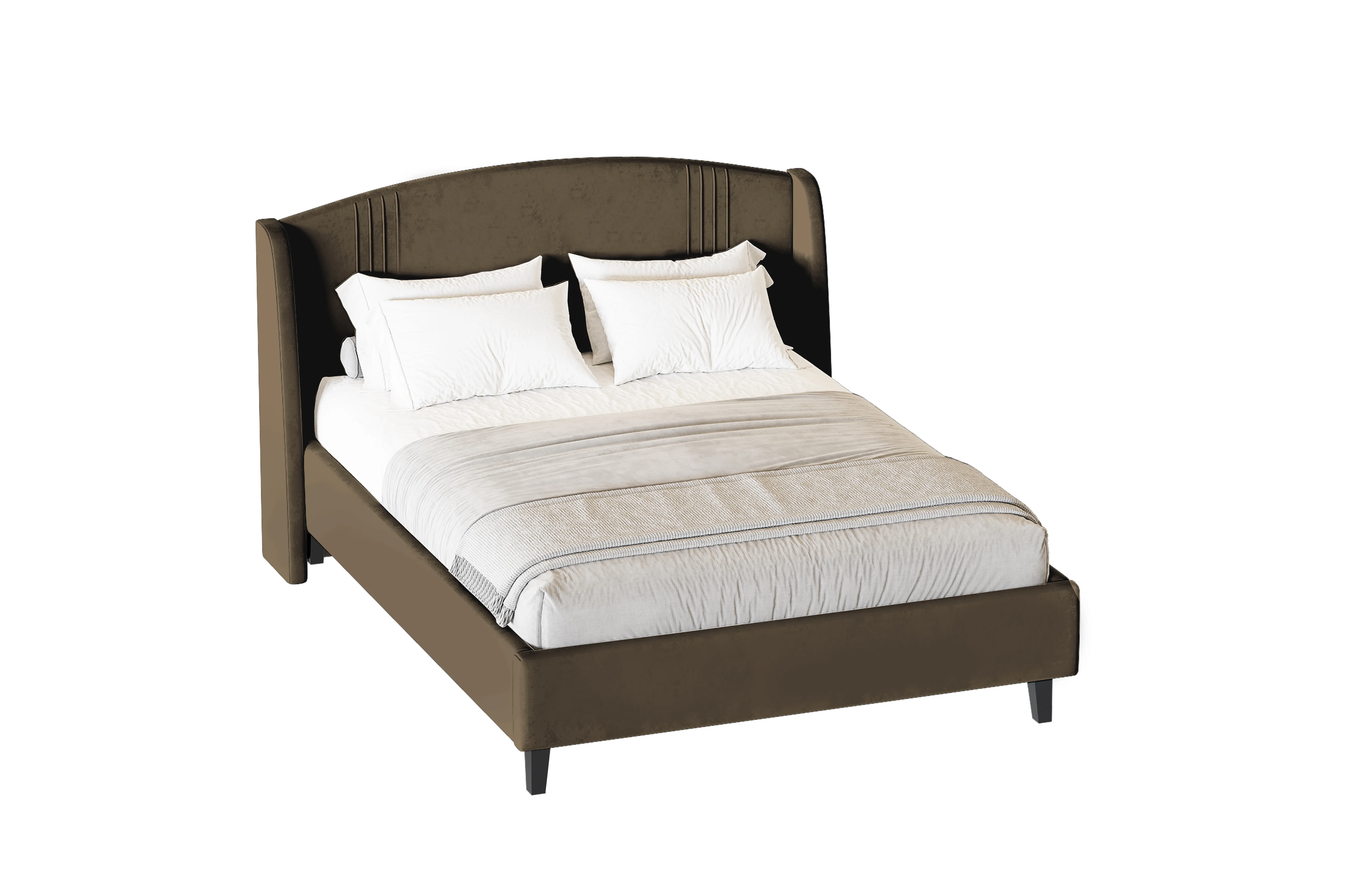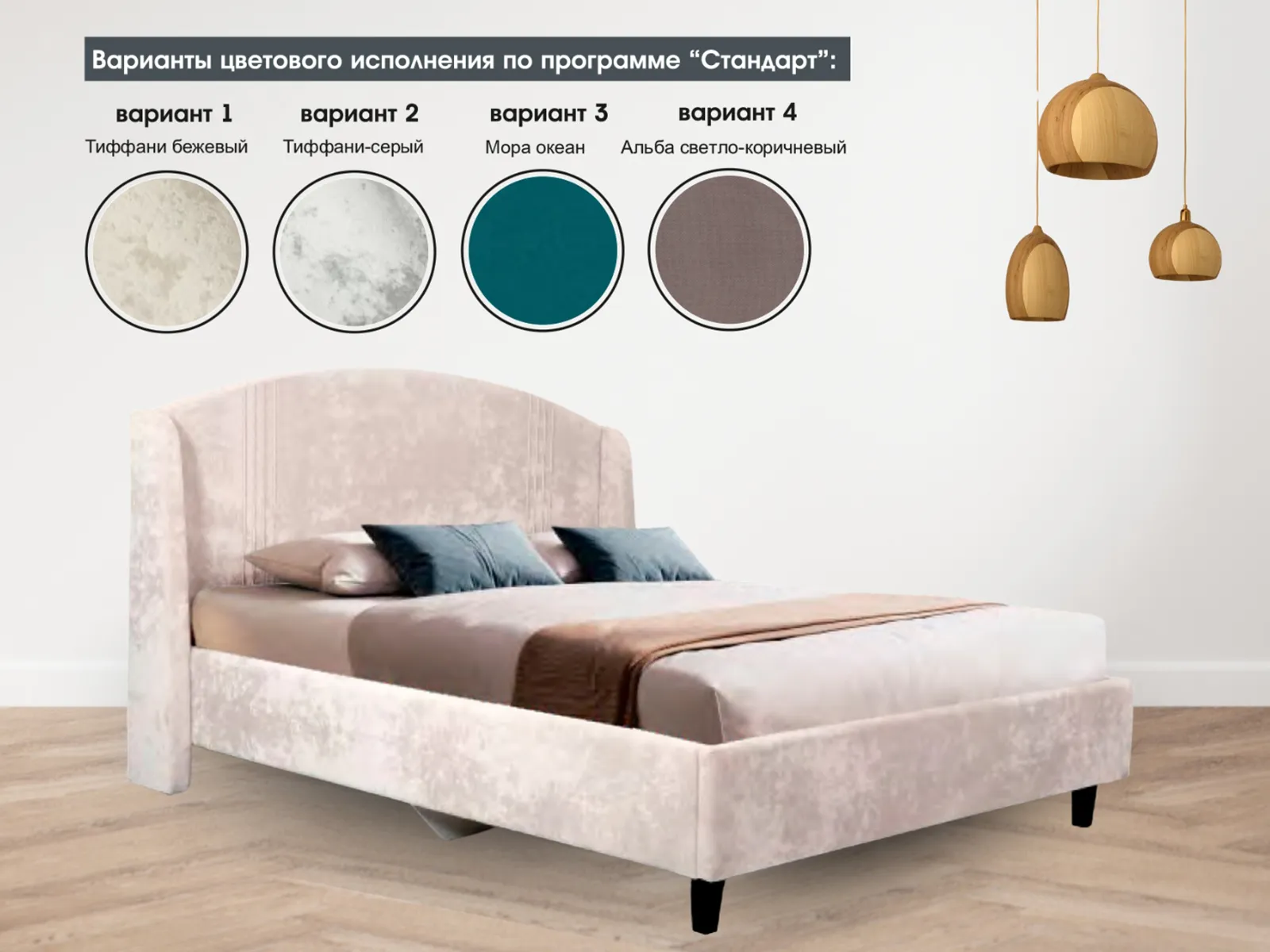 Каркас кровати обит мягким и приятным на ощупь велюром, который хорошо держит форму, устойчив к механическим воздействиям (в том числе к зацепкам от когтей животных), гипоаллергенен.