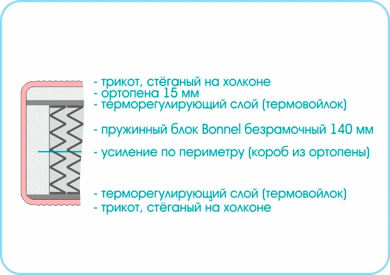 Слой ортопены надежно защищен от истирания слоем термовойлока, находящемся между ним и пружинным блоком, тем самым значительно продлевается срок службы матраса.
