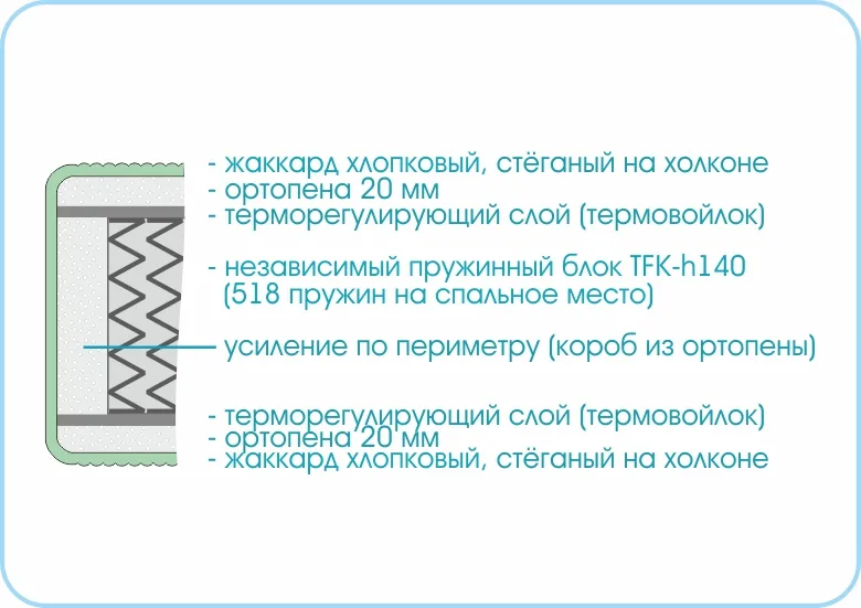 Прочный терморегулирующий слой устойчив к истиранию, что существенно продлевает срок службы изделия. Слой упругой ортопены улучшает анатомические свойства матраса, повторяя контуры тела спящего. Вы прекрасно выспитесь и утром будете чувствовать себя отлично!