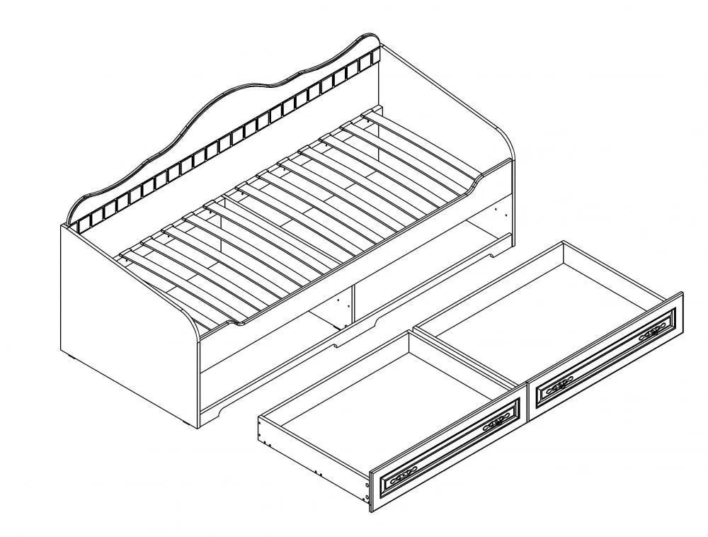 Комфортная детская кровать-софа, фигурная пристенная панель которой украшена минималистским резным декором, оснащена двумя вместительными выдвижными ящиками для белья под основанием. Матрасное основание и выдвижные ящики входят в комплектацию кровати. Матрас приобретается дополнительно.