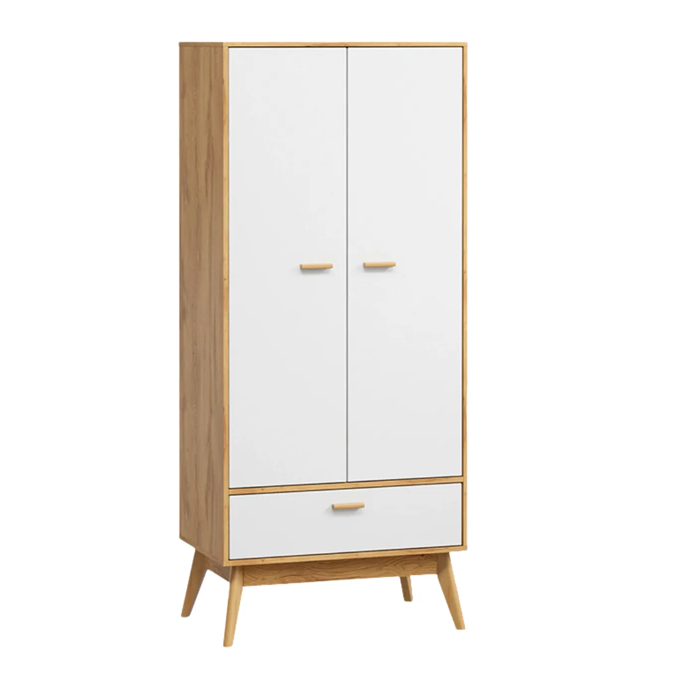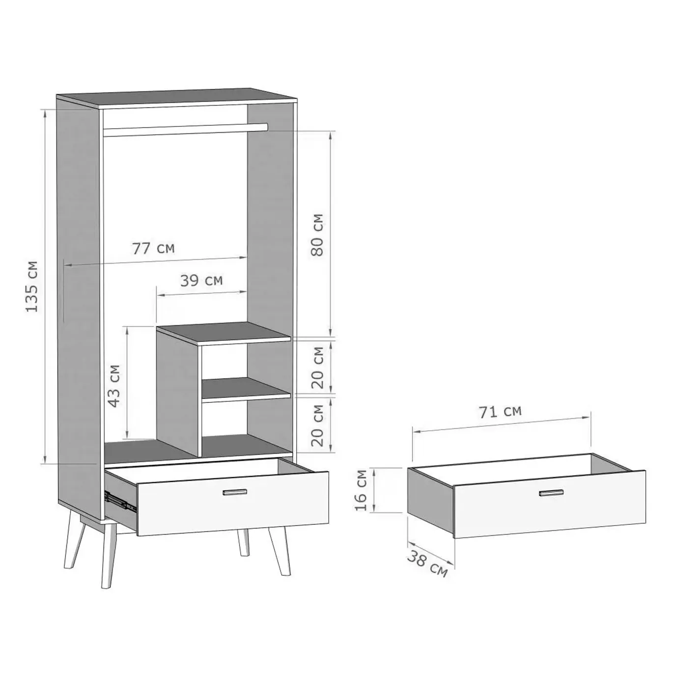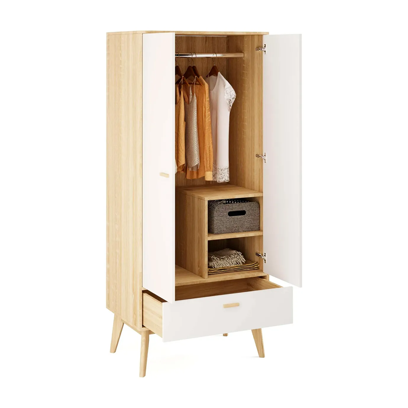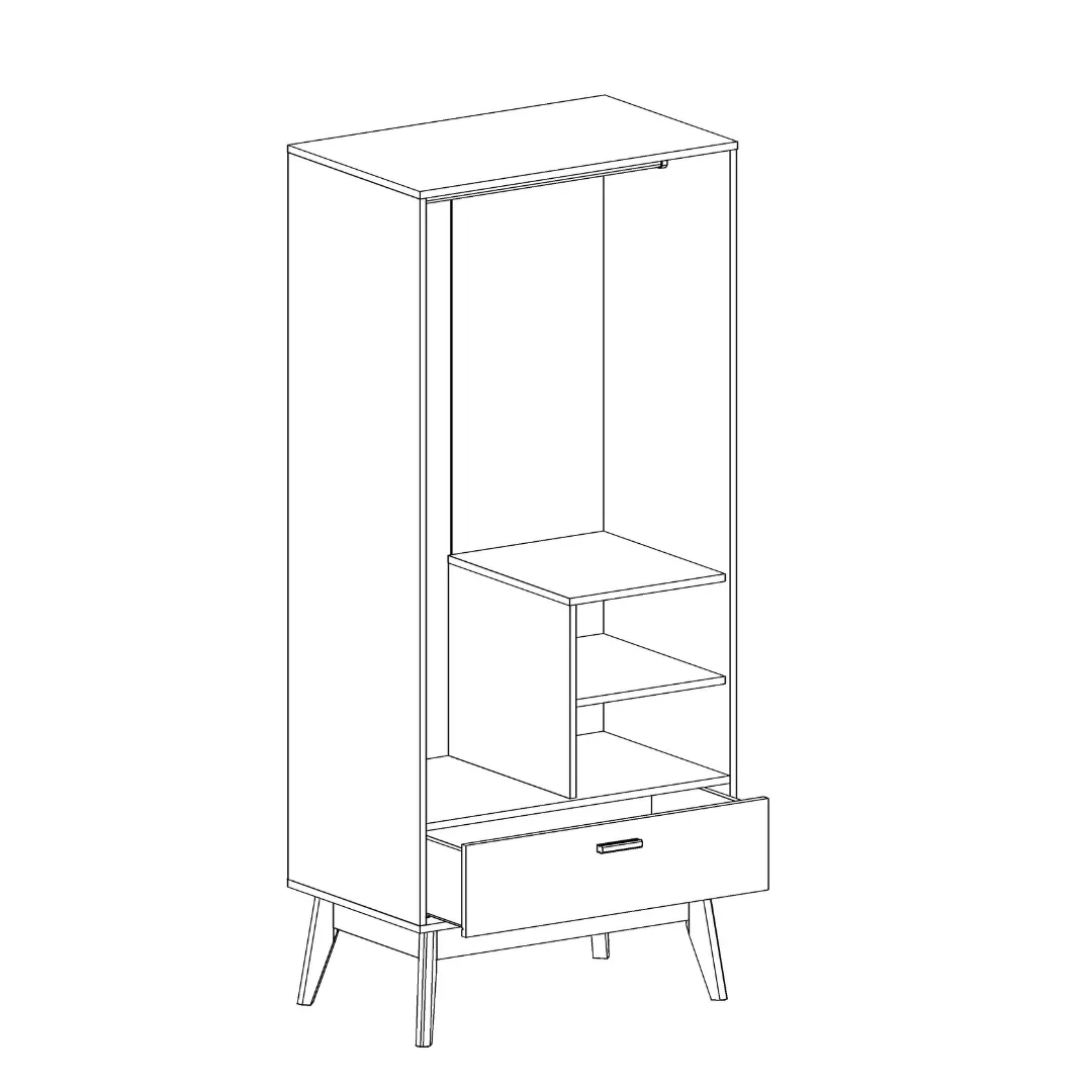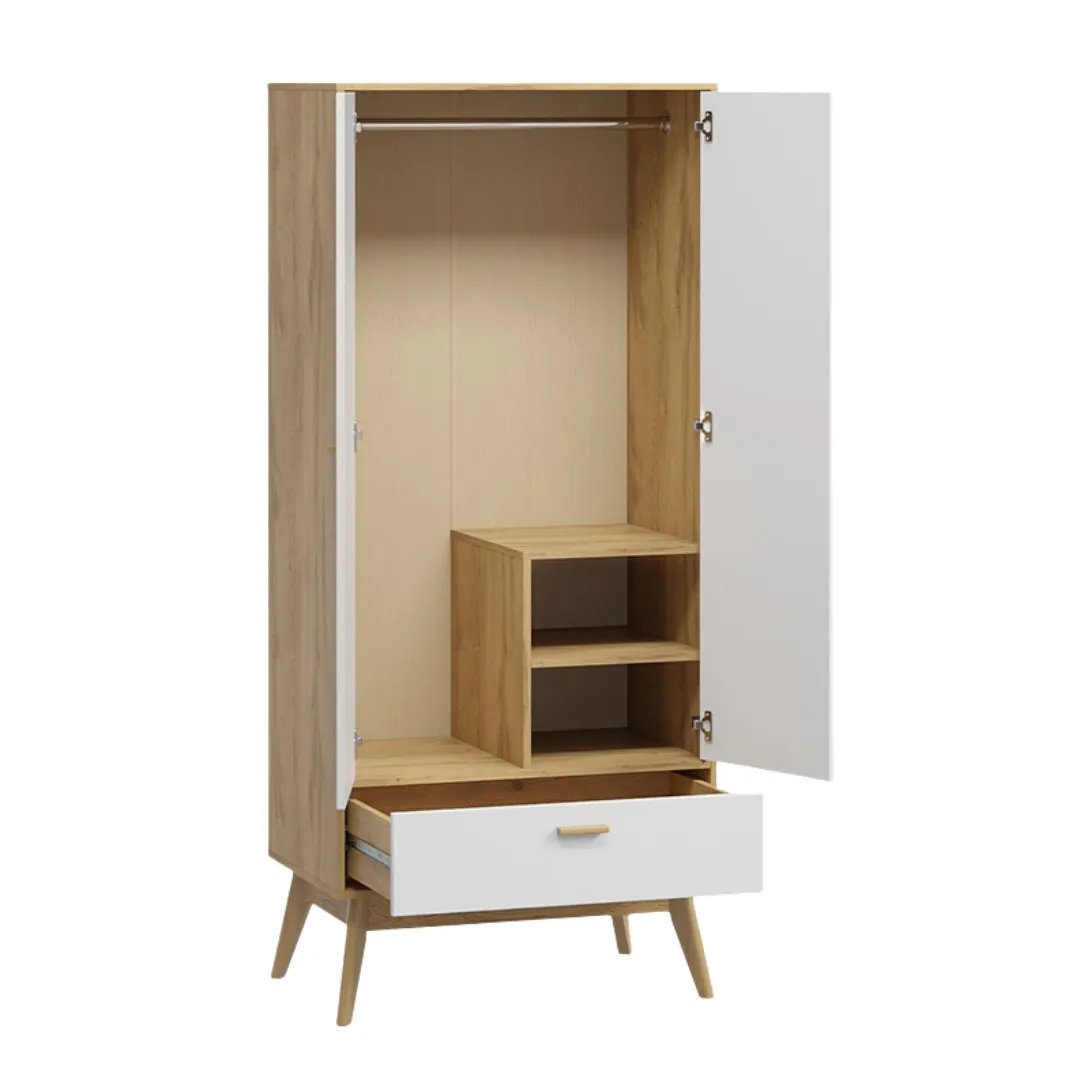 Внутри шкафа есть штанга для одежды и две глубоких полки, расположенных с правой стороны. В нижней части шкафа есть широкий вместительный выдвижной ящик на шариковых направляющих, который выдвигается легко и бесшумно. Корпус изделия выполнен из ЛДСП цвета натурального дуба. Фасады - из белого матового МДФ. Ручки сделаны из массива березы.