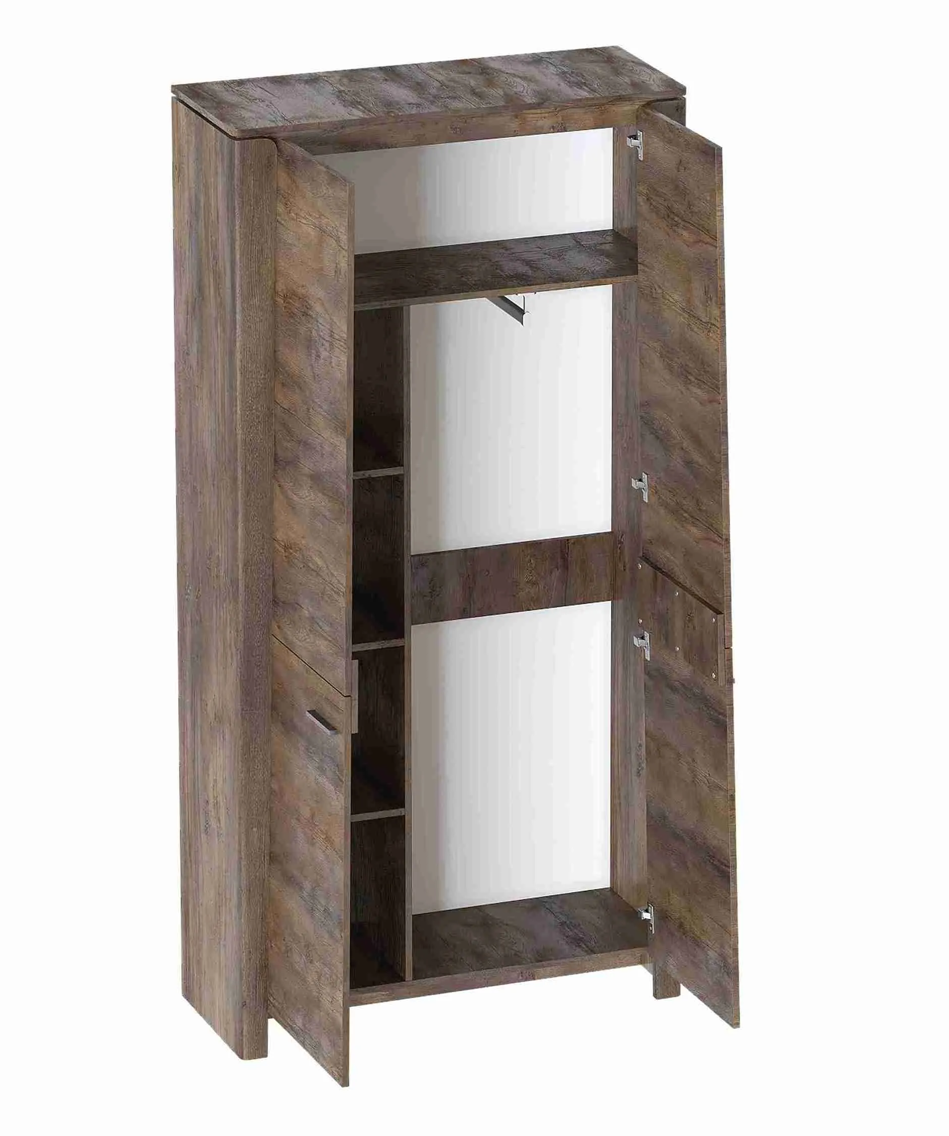 Внутреннее пространство шкафа разделено полкой на платяное с продольной стальной штангой и верхнее отделение для хранения белья. Фасады выполнены из МДФ, преимуществами данного материала являются влагостойкость, экологичность, гипоаллергенность, надёжность и долгий срок эксплуатации.
