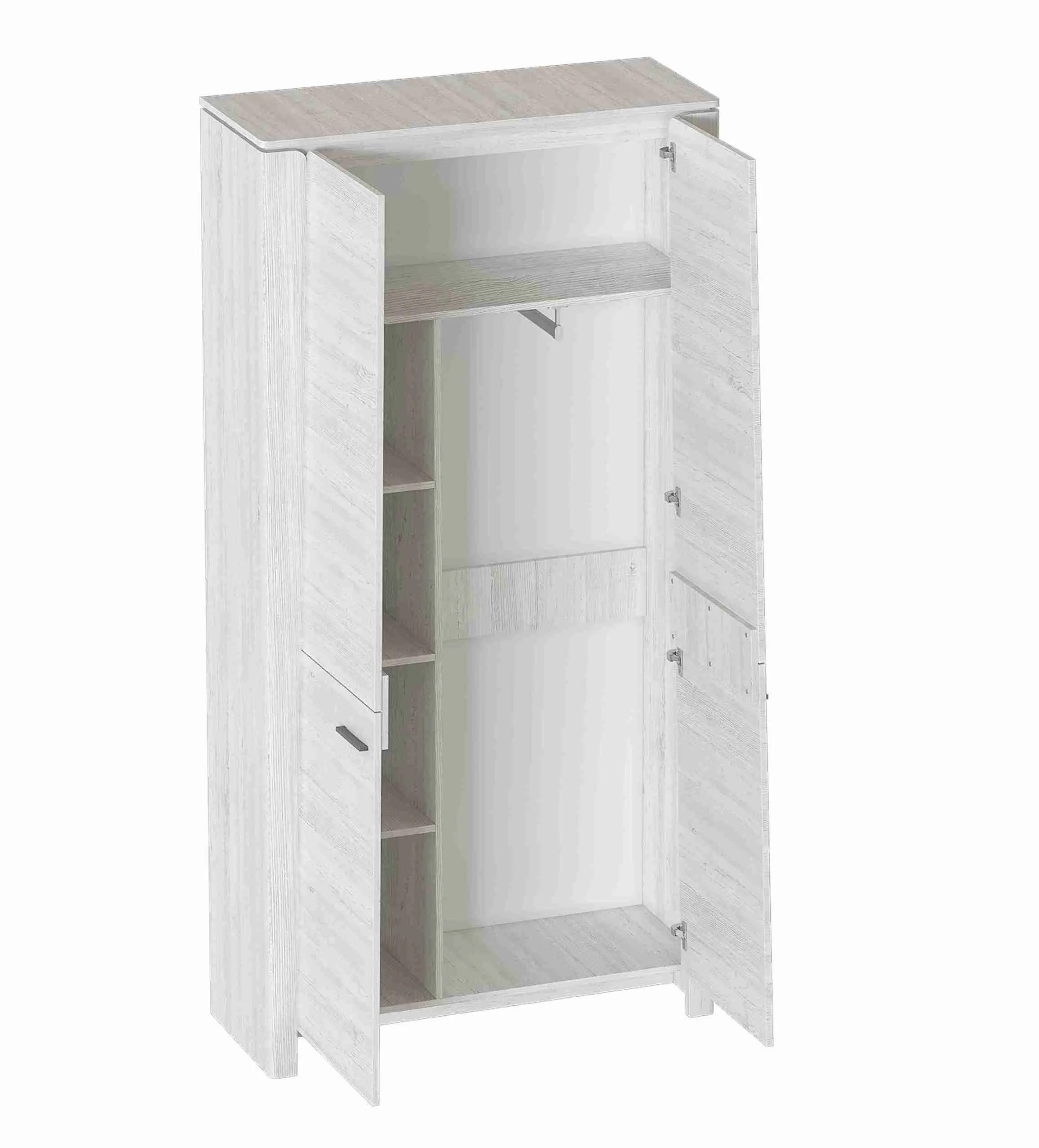 Внутреннее пространство шкафа разделено полкой на платяное с продольной стальной штангой и верхнее отделение для хранения белья. Фасады выполнены из МДФ, преимуществами данного материала являются влагостойкость, экологичность, гипоаллергенность, надёжность и долгий срок эксплуатации.