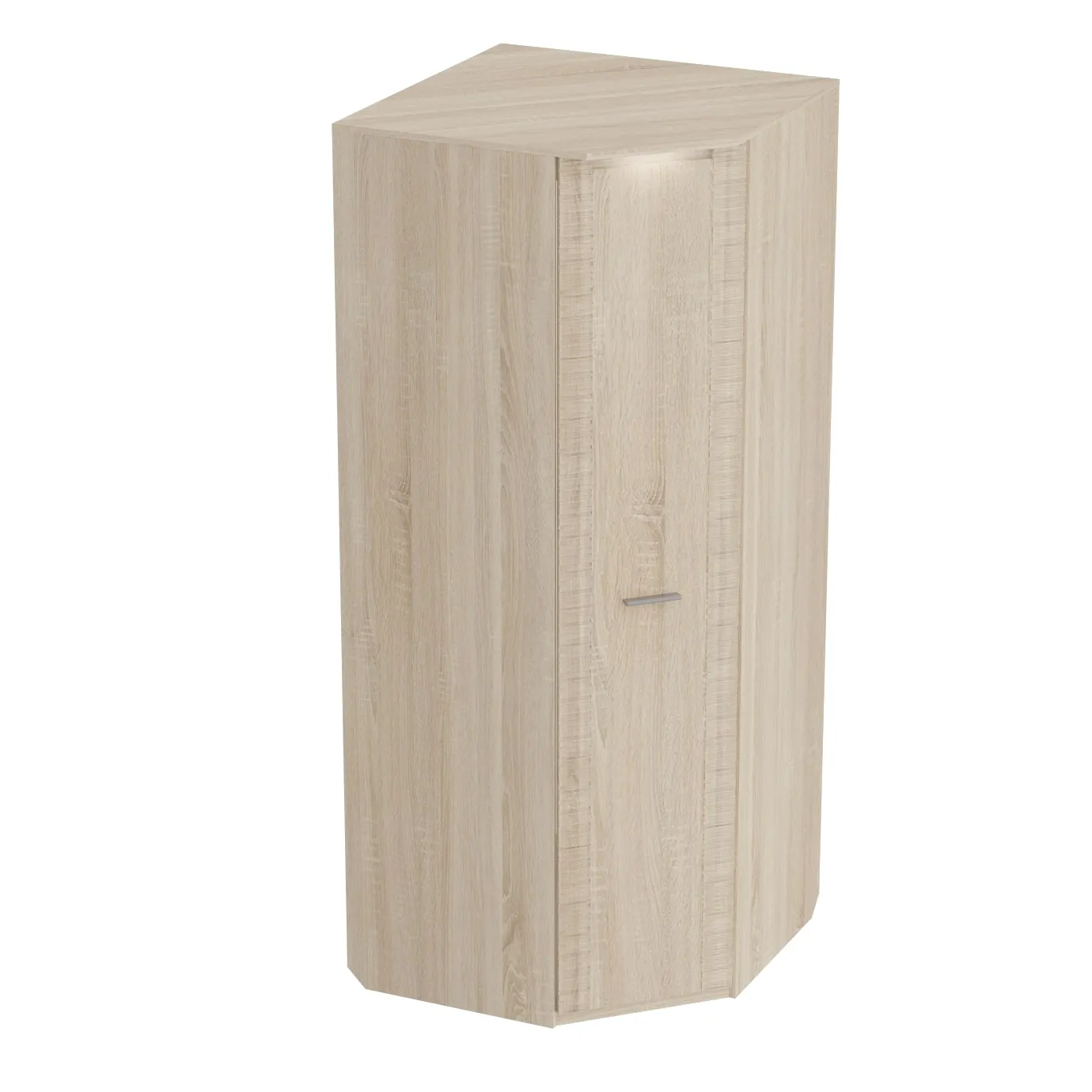 Угловой шкаф оснащен двумя отделениями: для белья с четырьмя жёсткими полками; платяное с жесткой полкой и продольной стальной штангой. В колпаке шкафа имеется паз для светильника, входящего в комплект. Блок питания приобретается отдельно, и рассчитан на подключение шести светильников.