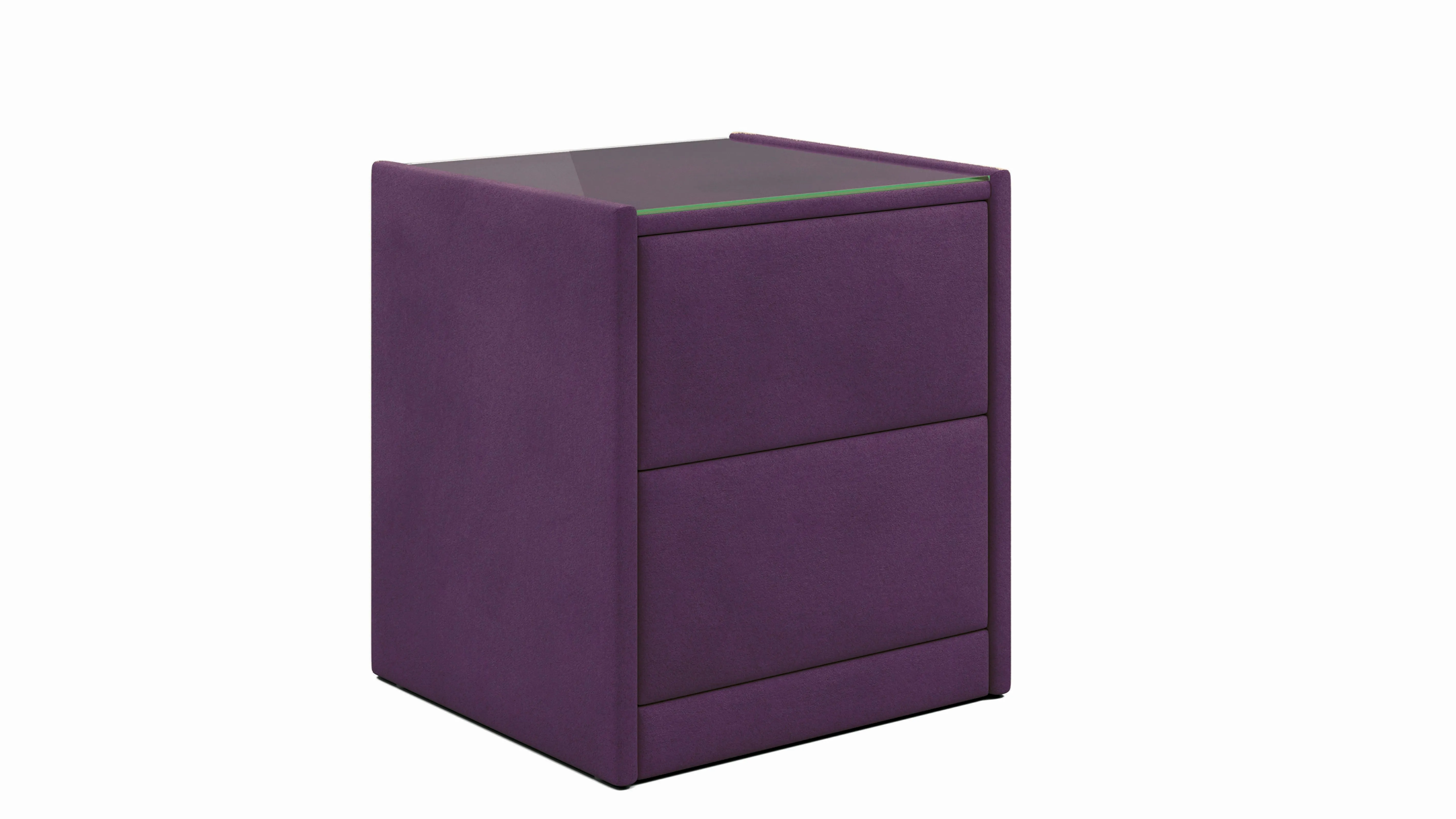Тумба обтянута высококачественным велюром, что придает ей особый уют и комфорт. Имеет стеклянную столешницу и два вместительных выдвижных ящика с механизмом Push to open. Скругленные торцы модели, минимизируют риск удариться в темноте.