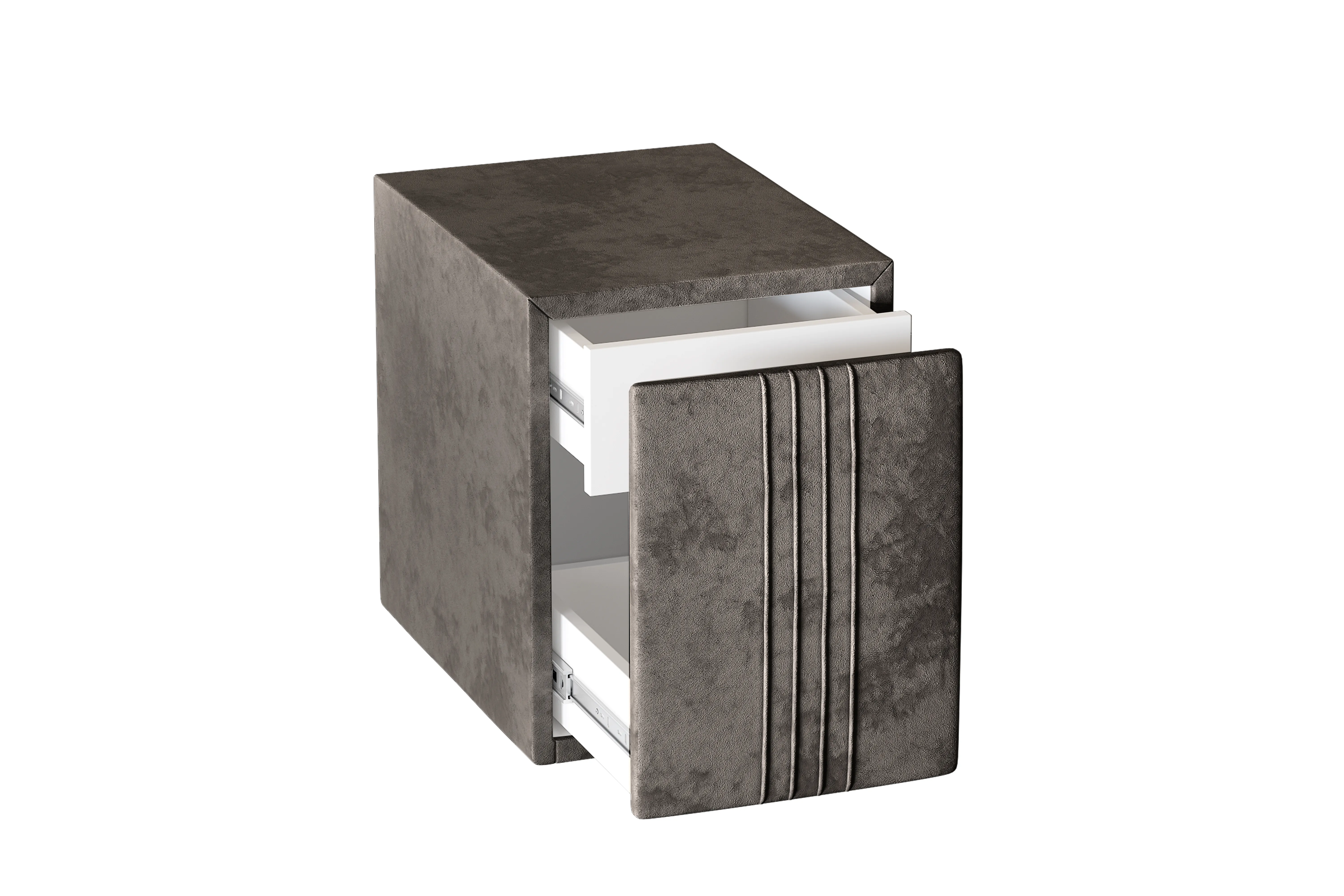 Тумба обтянута высококачественным велюром, имеет два вместительных выдвижных ящика с механизмом push to open. Скругленные торцы модели, минимизируют риск удариться в темноте.