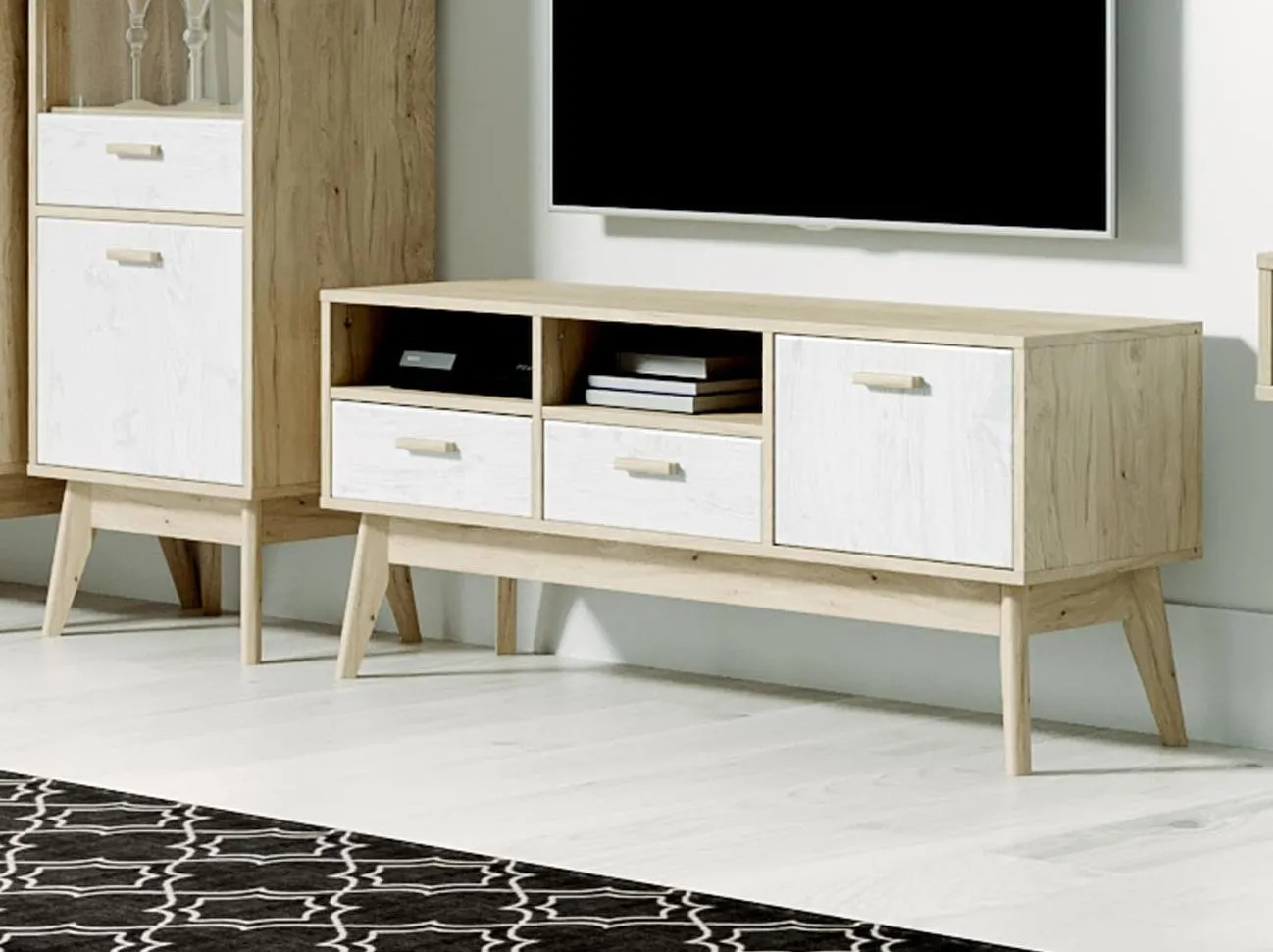 Тумба под ТВ "Калгари" сформирует композиционный центр ТВ-зоны и позволит сохранить больше свободного пространства в гостиной. На поверхности модуля можно расположить телевизор с диагональю до 55-60 дюймов.