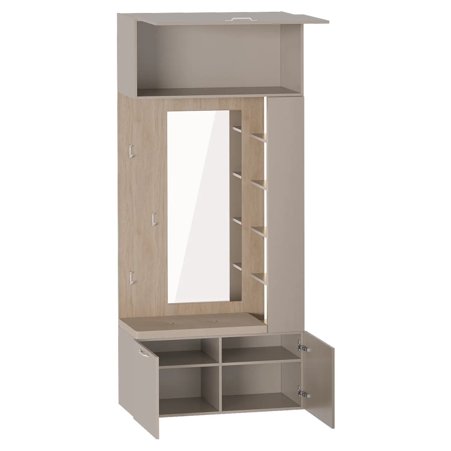 Верхняя полка модуля имеет встроенный газлифт и позволит разместить объемный чемодан. Вертикальный ряд полок выполнен на правую сторону, при желании можно распахнуть створку, прикрывающую ряд. Прочные крючки и ручки в форме скобы выполнены из белого матового металла. Все петли - плавного закрывания.