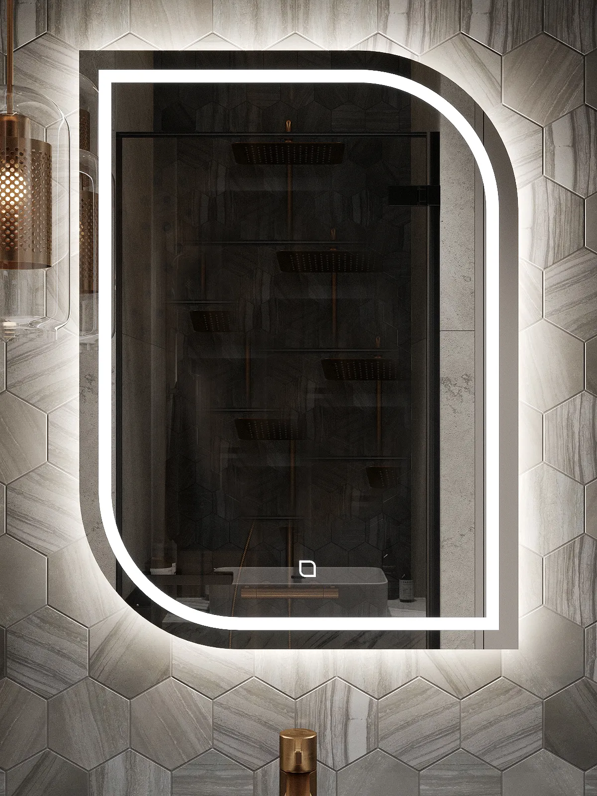 пескоструйная обработка в виде полосы шириной 15 мм, повторяющая контур зеркала |