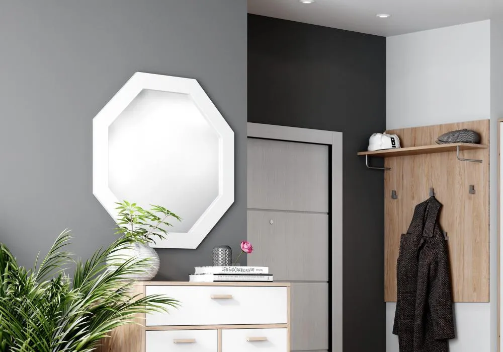 Обрамление зеркала выполнено в виде оригинальной рамы восьмиугольной формы из белоснежного МДФ, который нуждается в минимальном уходе и всегда выглядит нарядно. Вы можете использовать зеркало как отдельно, так и в комплекте с комодом "Калгари" или тумбой "Калгари" для прихожей.